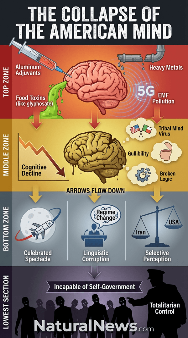 This is not an accident. It is the culmination of a multi-front war on human cognition, waged through toxic vaccines, processed food poisons, electromagnetic pollution, and a relentless propaganda machine that celebrates mediocrity and punishes truth. The evidence is everywhere, from the halls of government to the checkout line at the grocery store. We have crossed a cognitive event horizon, and the path back to reason seems all but lost [1]. Here’s how we got here, and why it matters for the survival of freedom itself.